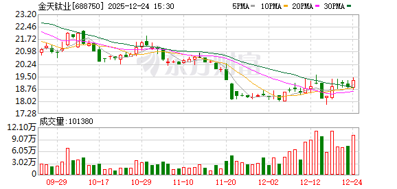 12月24日,金天钛业大宗交易成交181.04万股,成交额3456.13万元,占当日总成交额的15.1%,成交价19.09元,较市场收盘价19.24元折价0.78%。 | 交易日期 | 证券简称 | 证券代码 | 成交价(元) | 成交金额(万元) 成交量( * ) 买入营业部 | | | | 卖出营业部 | | --- | --- | --- | --- | --- | --- | --- | --- | --- | | 2025-12-24 | 金天钛业 | 688750 | 19.09 | 1909 | 100 | 机构专用 | 中国银河证券股份 有限公司北京珠市 口大街证券营业部 | | | 2025-12-24 | 金天钛业 | 688750 | 19.09 | 1547.13 | 81.04 | 中信建投证券股份 有限公司总部 | 机构专用 | | ...
