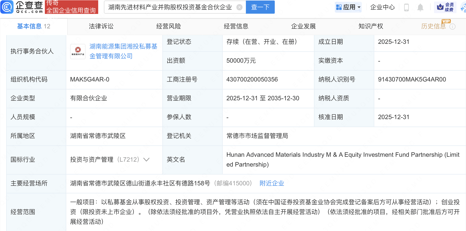 | 下台台 Ra 全国企业信用查询 | | 湖南先进材料产业并购股权投资基金合伙企业 ◎ | 查一下 | | --- | --- | --- | --- | | 基本信息 12 | 法律诉讼 | 经营风险 | 经营信息 | | 执行事务合伙人 | 湖南能源集团湘投私募基 | 登记状态 | 存续(在营、开业、 | | | 金管理有限公司 | 出资额 | 50000万元 | | 组织机构代码 | MAK5G4AR-0 | 工商注册号 | 430700200050356 | | 企业类型 | 有限合伙企业 | 营业期限 | 2025-12-31 至 2035- | | 人员规模 | | 参保人数 | l | | 所属地区 | 湖南省常德市武陵区 | 登记机关 | 常德市市场监督管理 | | 国标行业 | 投资与资产管理 (L7212) ∨ | 英文名 | Hunan Advanced Ma | | | | | ed Partnership) | | 主要经营场所 | 湖南省常德市武陵区德山街道永丰社区有德路158号(邮编415000) 附近企业 | | | | 经营范围 | 一般项目:以私募基金从事股权投资、投资管 ...