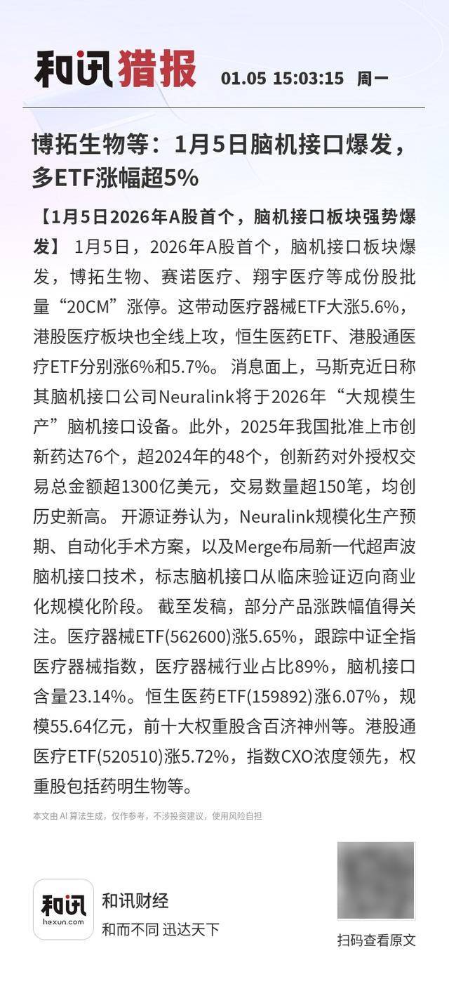 【1月5日2026年A股首个,脑机接口板块强势爆发】1月5日,2026年A股首个,脑机接口板块爆发,博 拓生物、赛诺医疗、翔宇医疗等成份股批量"20CM"涨停。这带动医疗器械ETF大涨5.6%,港股医疗板 块也全线上攻,恒生医药ETF、港股通医疗ETF分别涨6%和5.7%。 消息面上,马斯克近日称其脑机接 口公司Neuralink将于2026年"大规模生产"脑机接口设备。此外,2025年我国批准上市创新药达76个,超 2024年的48个,创新药对外授权交易总金额超1300亿美元,交易数量超150笔,均创历史新高。 开源证 券认为,Neuralink规模化生产预期、自动化手术方案,以及Merge布局新一代超声波脑机接口技术,标 志脑机接口从临床验证迈向商业化规模化阶段。 截至发稿,部分产品涨跌幅值得关注。医疗器械 ETF(562600)涨5.65%,跟踪中证全指医疗器械指数,医疗器械行业占比89%,脑机接口含量23.14%。恒 生医药ETF(159892)涨6.07%,规模55.64亿元,前十大权重股含百济神州等。港股通医疗ETF(520510)涨 5.72%,指数CXO浓度领先,权重股包括药明生物等。 本文由 ...