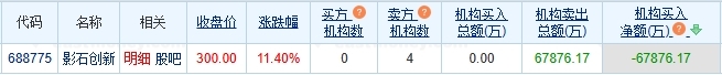 影石创新今日涨11.40% 4家机构专用席位净卖出6.79亿元
