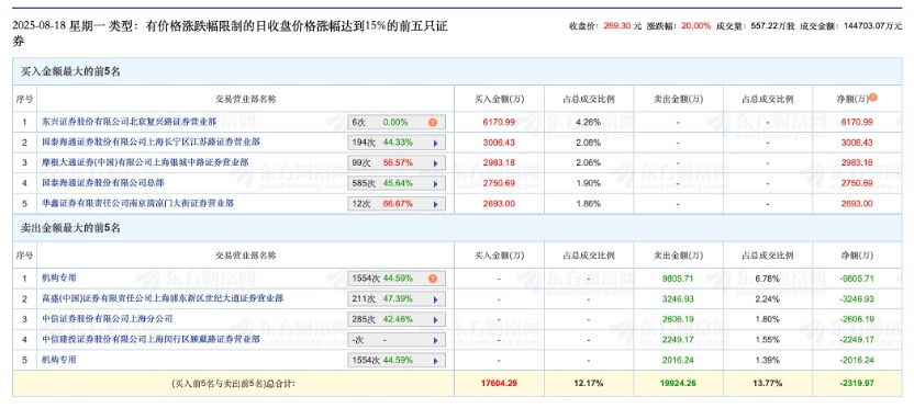 股价表现与交易数据 - 8月18日收盘价269.30元,涨停收盘,换手率18.27%,振幅7.64%,成交额14.47亿元 [2] - 因日收盘价涨幅达15%登上科创板龙虎榜 [2] 龙虎榜资金动向 - 前五大买卖营业部合计成交3.75亿元,其中买入1.76亿元,卖出1.99亿元,净卖出2319.97万元 [2] - 第一大买入营业部为东兴证券北京复兴路证券营业部,买入6170.99万元 [2] - 卖出营业部中出现2家机构专用席位,分别卖出9805.71万元和2016.24万元,合计净卖出1.18亿元 [2] 主力资金流向 - 当日全天主力资金净流入5470.31万元 [3] 买卖席位明细 - 买入金额前五席位包括东兴证券北京复兴路(6170.99万元)、国泰海通上海江苏路(3006.43万元)、摩根大通上海银城中路(2983.18万元)等 [3] - 卖出金额前五席位包括机构专用(9805.71万元)、高盛中国上海世纪大道(3246.93万元)、中信证券上海分公司(2606.19万元)等 [3]