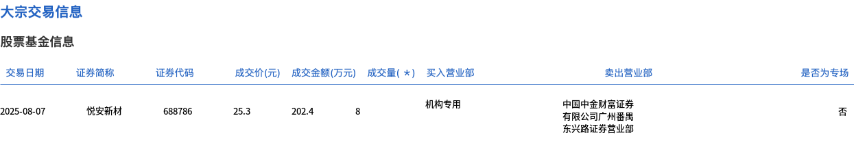 大宗交易概况 - 2025年8月7日发生大宗交易成交8万股,成交金额202.4万元,占当日总成交额1.35% [1] - 成交价格25.3元,较市场收盘价27.8元折价8.99% [1] 交易细节 - 证券简称为悦安新材,证券代码688786 [2] - 买入方为机构专用席位,卖出方为中国中金财富证券有限公司广州番禺营业部 [2]