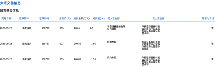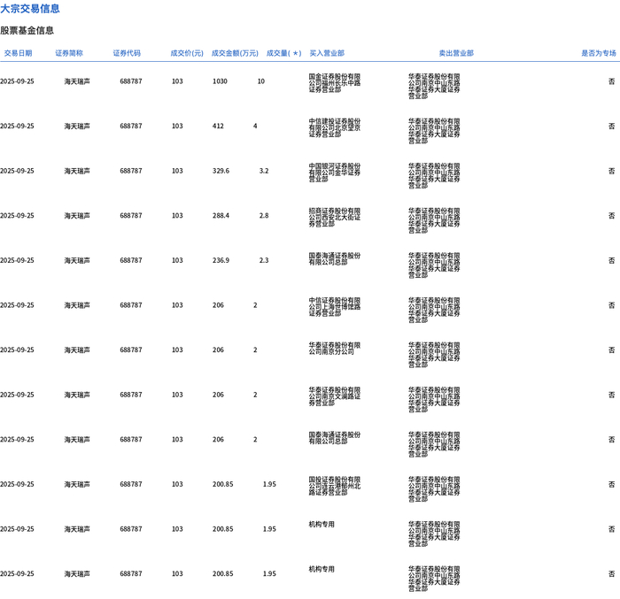 大宗交易概况 - 2025年9月25日海天瑞声发生大宗交易成交36.15万股 成交总额3723.45万元 占当日总成交额6.76% [1] - 大宗交易成交价103元 较市场收盘价126.68元折价18.69% [1] 交易明细分析 - 共发生11笔大宗交易 单笔成交量在1.95万股至10万股之间 单笔成交金额在200.85万元至1030万元之间 [2] - 所有交易成交价均为103元 与大宗交易整体成交价一致 [2] - 涉及多家营业部包括金融集团 南京中山东路等 出现机构专用席位参与交易 [2]