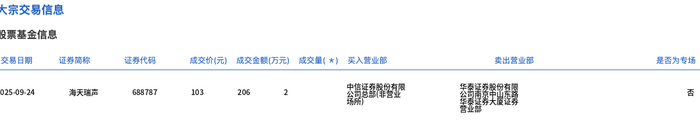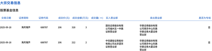 大宗交易概况 - 2025年9月18日海天瑞声发生大宗交易成交5万股 成交金额530万元 占当日总成交额1.29% [1] - 成交均价106元 较市场收盘价123.86元折价14.42% [1] 交易明细分析 - 分两笔执行:首笔3万股成交价105元 金额318万元 买方为国信证券福州五一中路营业部 卖方为华泰证券南京中山东路营业部 [2] - 第二笔2万股成交价106元 金额212万元 买方为中信建投北京望京营业部 卖方为华泰证券南京中山东路营业部 [2] - 两笔交易卖方均为华泰证券南京中山东路营业部 显示集中减持特征 [2] 价格表现 - 大宗交易价格106元显著低于当日收盘价123.86元 折价幅度达14.42% [1] - 两笔交易价格存在差异:首笔105元 第二笔106元 均大幅低于市价 [2]