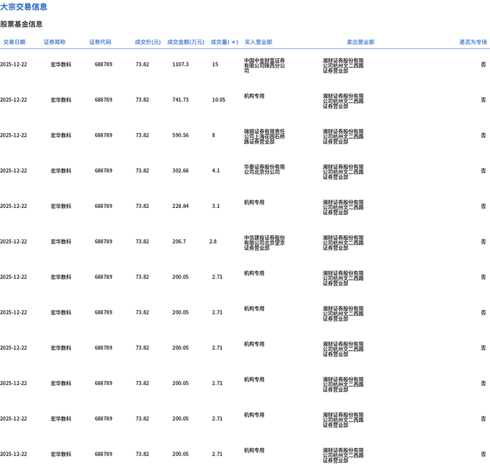 | 交易日期 | 证券調核 | 证券代码 | | | 成交价(元) 成交金额(万元) 成交量(*) 买入营业部 | | | 类出营业部 | 是否为专场 | | --- | --- | --- | --- | --- | --- | --- | --- | --- | --- | | 2025-12-22 | 宏华数科 | 688789 | 73.82 | 1107.3 | 15 | 大量 | | | 종 | | 2025-12-22 | 宏华数科 | 688789 | 73.82 | 741.73 | 10.05 | 机构专用 | | | 190 | | 2025-12-22 | 宏华数科 | 688789 | 73.82 | 590.56 | 8 | | | | 종 | | 2025-12-22 | 宏华数科 | 688789 | 73.82 | 302.66 | 4.1 | 公司 2017-02-20 | | | KA | | 2025-12-22 | 宏华数科 | 688789 | 73.82 | 228.84 | 3.1 | 机构专用 | | | る | | 2025-12-22 | 宏华数科 | 6 ...