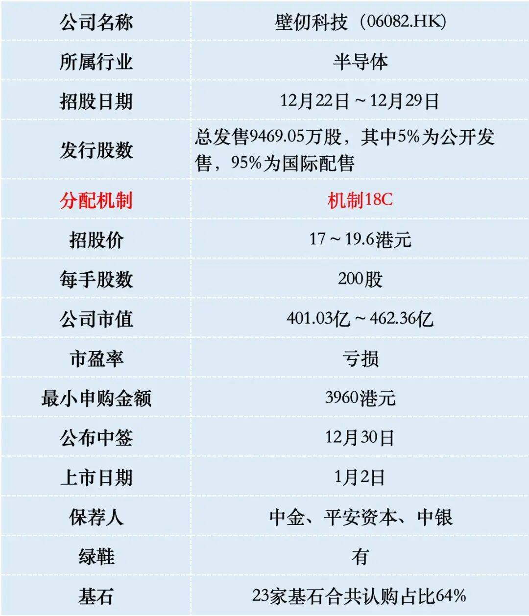 港股IPO市场近期动态 - 2025年12月港交所迎来IPO冲刺,单月有25家公司成功上市,全年累计上市114只,创下近五年来港股IPO数量的新高 [1] - 目前仍有10家公司已通过港交所聆讯,预计将在2026年1月招股上市 [1] - 由于港交所规定招股书有效期为6个月,在2025年6月30日前递交的申请需在2026年1月1日前补充年报,因此市场正全力推进IPO进程 [1] 壁仞科技IPO核心信息 - 公司名称壁仞科技,股票代码06082.HK,预计于2026年1月2日上市,将成为2026年港股“第一股” [1] - 招股日期为2025年12月22日至12月29日,发行总股数9469.05万股,其中公开发售占5%,国际配售占95% [1] - 招股价区间为17至19.6港元,每手200股,最小申购金额为3960港元,公司市值区间为401.03亿至462.36亿港元 [1] - 本次发行采用机制18C,设有绿鞋机制,并由中金、平安资本、中银担任保荐人 [1] 公司业务与运营模式 - 壁仞科技成立于2019年,主营业务为GPU芯片设计,开发通用图形处理器芯片及基于GPGPU的智能计算解决方案,为人工智能提供基础算力 [1] - 公司采用无晶圆厂模式运营,委托第三方合约制造商进行半导体晶圆制造及最终产品的组装、测试与封装 [2] - 公司战略聚焦于高算力需求行业,包括AI数据中心、电信、AI解决方案、能源及公用事业、金融科技及互联网,并与各行业大客户建立战略合作关系 [3] 财务表现与对比分析 - 公司收入呈现快速增长:2022年收入为49.9万元人民币,2023年跃升至6203万元人民币,2024年增长至3.368亿元人民币,2025年上半年收入为5890.3万元人民币 [4][5] - 公司处于亏损状态:2022年至2024年净亏损分别为14.743亿元、17.44亿元、15.381亿元人民币,2025年上半年再亏16.005亿元人民币,三年半累计亏损超63亿元人民币 [5] - 与同业对比:2025年上半年,壁仞科技收入0.59亿元人民币,低于摩尔线程的7.02亿元和沐曦股份的9.15亿元;毛利率为31.9%,亦低于摩尔线程的69.17%和沐曦股份的55.26% [5] 技术优势与产品布局 - 公司拥有原创的GPGPU架构和软硬件全栈能力 [6] - 已开发出第一代GPGPU架构,并基于此推出BR106、BR110和BR166三款芯片产品;其中BR166采用先进的芯粒封装技术,通过共封装两个BR106芯片裸晶实现性能翻倍,是国内首家采用2.5D芯粒技术封装双AI计算裸晶的企业 [6] - 软件方面,公司自主研发BIRENSUPA软件平台,提供编程接口、高性能算法库、训练与推理框架及完整工具链,并兼容第三方GPGPU计算软件平台以降低用户迁移成本 [6] 市场竞争格局与增长潜力 - 在中国智能计算芯片市场,英伟达和华为昇腾合计占据94.4%的市场份额;在更细分的GPGPU市场,英伟达独占97.6%的份额 [7] - 壁仞科技当前在中国智能计算芯片市场和GPGPU市场的份额分别仅为0.16%和0.2% [8] - 中国智能计算芯片市场规模预计将从2024年的301亿美元增长至2029年的2012亿美元,年复合增长率达46.3%;同期本土企业合并市场份额有望从约20%提升至约60%,国产替代空间广阔 [8] - 截至2025年12月15日,公司已签订总价值约12.41亿元人民币的框架协议和销售合同 [8] 估值对比与市场预期 - 同为“国产GPU四小龙”的摩尔线程和沐曦股份在A股上市后累计涨幅高达4倍;摩尔线程市值2980亿元人民币,沐曦股份市值2483亿元人民币,而壁仞科技市值上限为462.36亿港元,为二级市场留下较大想象空间 [8] 本次IPO发行细节与投资者结构 - 本次IPO发行股份占全部股份比例的10.5%,按招股价上限19.6港元计算,募资额约为48.6亿港元 [9] - 此次上市吸引了23家基石投资者,包括启明创投、平安人寿、上海景林、瑞银集团等知名机构,合计认购近29亿港元,基石认购占比高达64%,创下新股基石投资者数量及认购占比的纪录 [9] 新股申购与中签率预测 - 公司此次发行采用18C回拨机制,香港公开发售初始占比5%,根据超额认购倍数可能回拨至10%或20% [10] - 目前孖展认购已达474倍,预计最终超额认购可能达1800倍,触发回拨至20% [10] - 若申购人数按25万人计算,预估一手中签率为5%,甲组尾段中签1手;乙组若按2万人申购计算,预估乙组头段中签1至2手 [10][11]