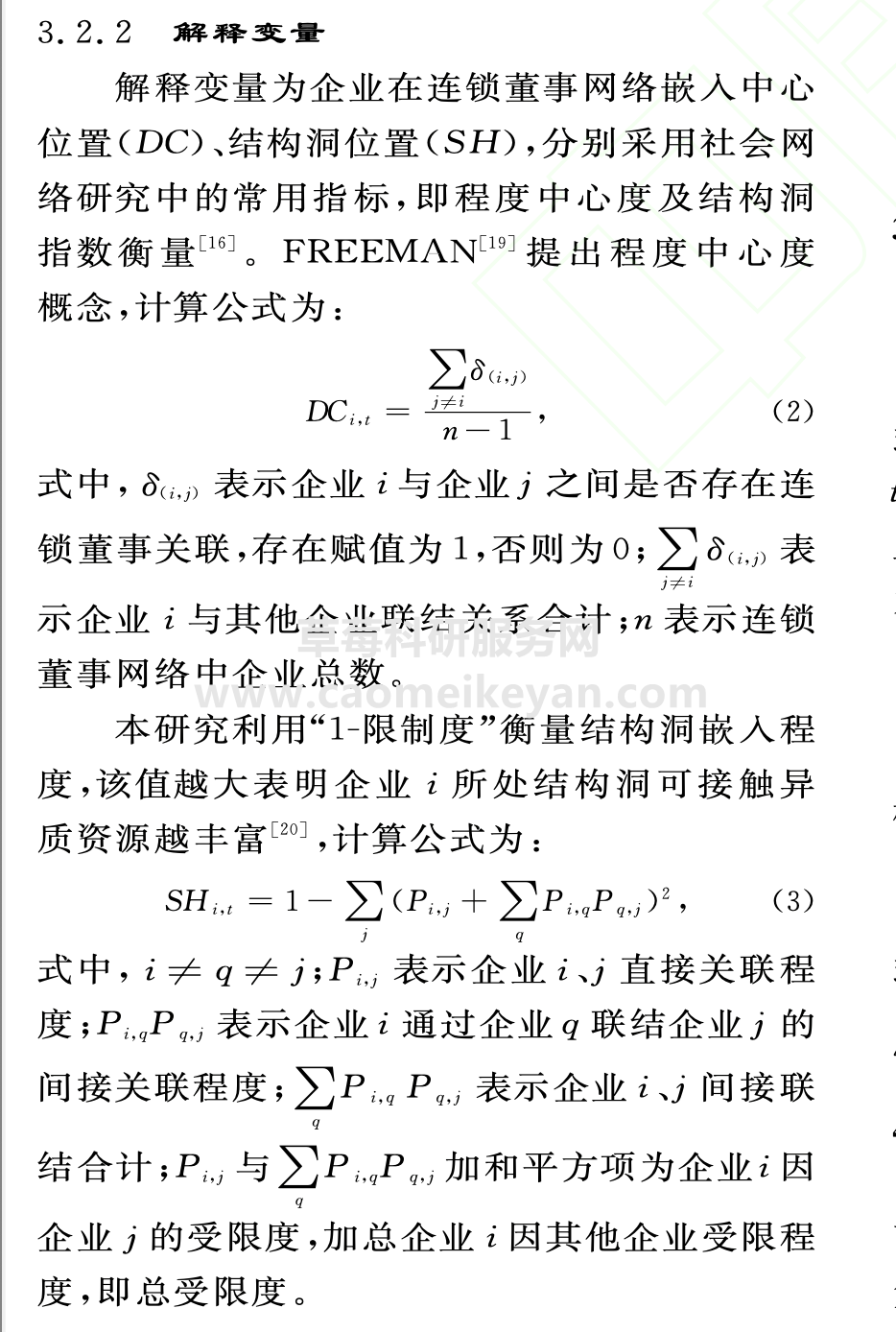 1、资料名称:2024-1999年上市公司企业连锁董事网络嵌入数据、连锁董事网络数据 此数据为科研课题组自用数据,非仅仅只有一个结果胡编乱造(根据参考文献瞎编结果根本就没有研究价值,不能反映真正的连锁董事网络,实证围绕着错 的结果根本就毫无意义浪费大家时间),真正的原创一手认真整理数据,数据处理较为复杂大家可以自行试试! 3.2.2 解释变量 解释变量为企业在连锁董事网络嵌入中心 位置(DC)、结构洞位置(SH),分别采用社会网 络研究中的常用指标,即程度中心度及结构洞 指数 衡量116]。FREEMAN 提出程度中心度 概念,计算公式为: $$D C_{i,t}=\frac{\sum_{j\neq i}\delta_{(i,j)}}{n-1}\,,\qquad\qquad(2)$$ 2、测算方式:参考顶刊《管理学报》朱建新(2025)老师的做法,解释变量为企业在连锁董事网络 嵌 入中心位置 、 结构洞位 置 , 分 别 采 用 社 会 网络 研究中的 常 用 指 标, 即 程 度 中 心 度 及 结 构 洞指数 衡 量]。提 出 程 度 中 心 度概念, 计算公式 本研究利用" 1 限制 度" 衡 量 结 ...