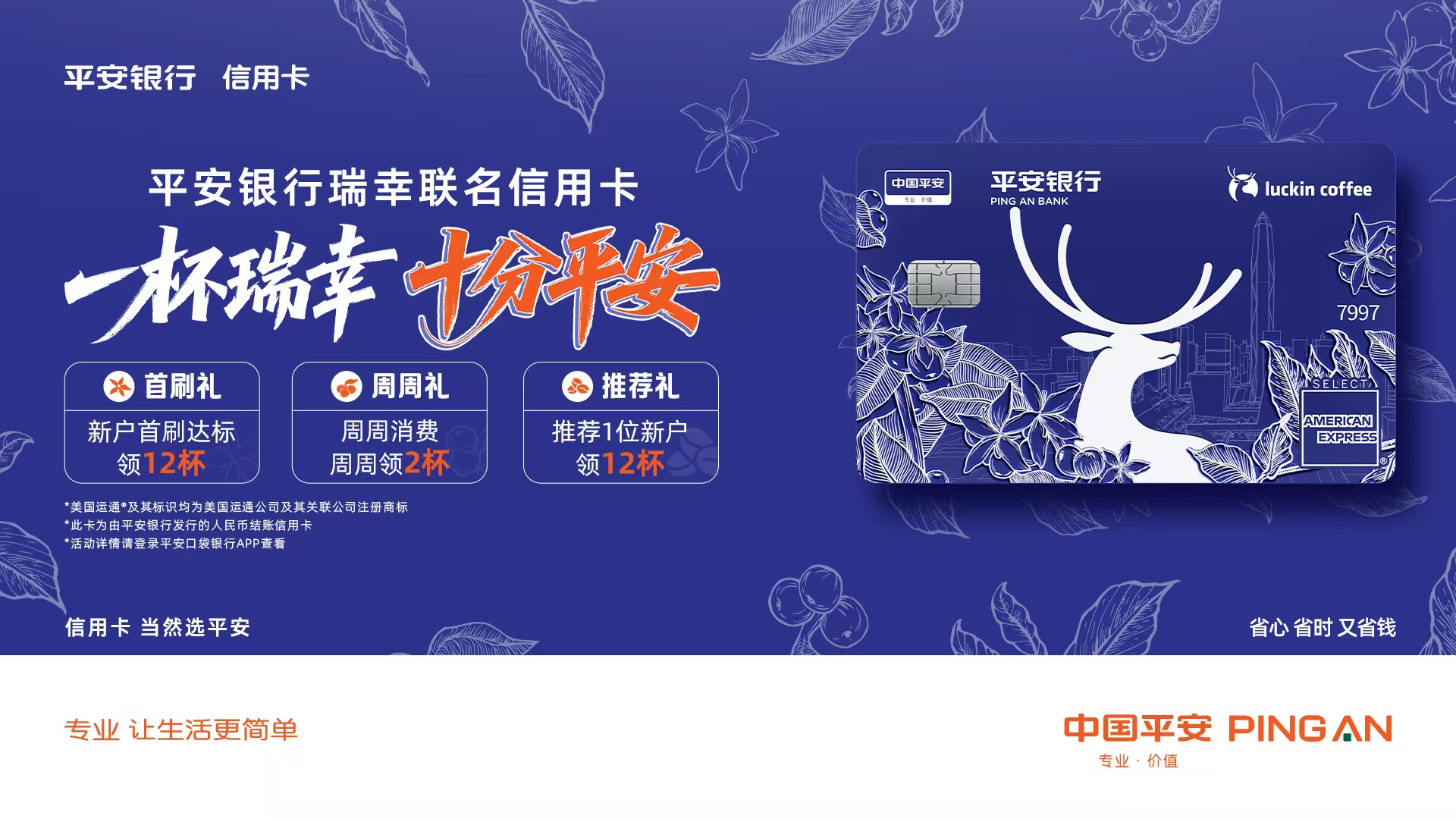 12月29日,平安银行信用卡与瑞幸咖啡联合打造的平安银行瑞幸联名信用卡正式亮相,该卡以咖啡为情感纽带,向广大客户传递"一杯瑞幸,十分平安"的新 年祝愿,陪伴年轻人在冬日里温暖前行。 卡面设计吸睛,兼具质感与金融美学 12杯推荐礼:邀请好友办卡领12杯。已经持有平安信用卡的客户,通过推荐好礼活动页面,每成功邀请一位新户好友办理平安银行瑞幸联名信用卡并完成首 刷,即可获得12张瑞幸咖啡券,至多可推荐30位好友参与。 作为平安银行信用卡五大基础保障升级后的首张跨界联名力作,该卡还提供全面增值服务,涵盖72小时盗刷免赔保障、100万元交通意外保障、12次免费AI 问诊、多种还款模式及1V1企微客服。此外,依托美国运通的资源加持,持卡人可尊享运通专属礼遇,包括星级酒店自助餐买一赠一、下午茶5折优惠,以 及指定地区境外消费2%返现等多重惊喜。(详见"美国运通卡礼遇"小程序) 周周畅享权益叠加,助力客户实现咖啡自由 咖啡已成为现代职场人工作通勤、社交休闲的生活方式标配,平安银行信用卡精准捕捉这一消费趋势,与瑞幸咖啡共同设计出贴近年轻人消费节奏的权益体 系。首年免年费,消费满6笔免次年年费,覆盖咖啡及多项特色权益,2025年 ...