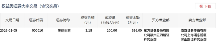 | 交易日期 | 证券代码 | 证券简称 | 成交价格 | 成交量 | 成交金额 | 买方营业部 | 卖方营业部 | | --- | --- | --- | --- | --- | --- | --- | --- | | | | | (元) | (万股/万份) | (万元) | | | | 2026-01-05 | 000010 | 美丽生态 | 3.18 | 200.00 | | 636.00 东方证券股份有限 | 南京证券股份有限 | | | | | | | | 公司福州五四路证 | 公司上海浦东新区 | | | | | | | | 券营业部 | 灵山路证券营业部 | 1月5日,美丽生态大宗交易成交200万股,成交额636万元,占当日总成交额的11.17%,成交价3.18元, 较市场收盘价3.49元折价8.88%。 ...