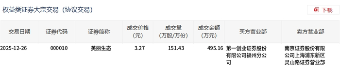 12月26日,美丽生态大宗交易成交151.43万股,成交额495.16万元,占当日总成交额的8.77%,成交价 3.27元,较市场收盘价3.56元折价8.15%。 | 交易日期 | 证券代码 | 证券简称 | 成交价格 | 成交量 | 成交金额 买方营业部 | | 卖方营业部 | | --- | --- | --- | --- | --- | --- | --- | --- | | | | | (元) | (万股/万份) | (万元) | | | | 2025-12-26 | 000010 | 美丽生态 | 3.27 | 151.43 | 495.16 第一创业证券股份 | | 南京证券股份有限 | | | | | | | | 有限公司福州分公 | 公司上海浦东新区 | | | | | | | | 리 | 灵山路证券营业部 | | 权益类证券大宗交易(协议交易) | | --- | ...