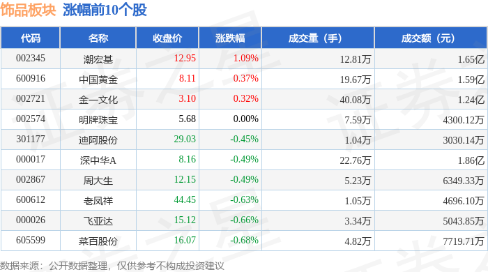 | 代码 | 名称 | 收盘价 | 涨跌幅 | 成交量(手) | 成交额(元) | | --- | --- | --- | --- | --- | --- | | 600735 | ST新华锦 | 4.90 | -4.30% | 15.90万 | 7937.41万 | | 002731 | 幸华珠宝 | 13.02 | -3.77% | 15.44万 | 2.03亿 | | 300945 | 曼卡龙 | 16.82 | -1.64% | 7.39万 | 1.25亿 | | 603900 | 莱坤通灵 | 8.79 | -1.46% | 5.22万 | 4600.22万 | | 600439 | 瑞贝卡 | 2.78 | -1.07% | 15.80万 | 4400.27万 | | eossaa | 菜自股份 | 16.07 | -0.68% | 4.82万 | 7719.71万 | | 000026 | 飞亚达 | 15.12 | -0.66% | 3.34万 | 5043.85万 | | 600612 | 老凤祥 | 44.45 | -0.63% | 1.05万 | 4696.10万 | | 002867 ...