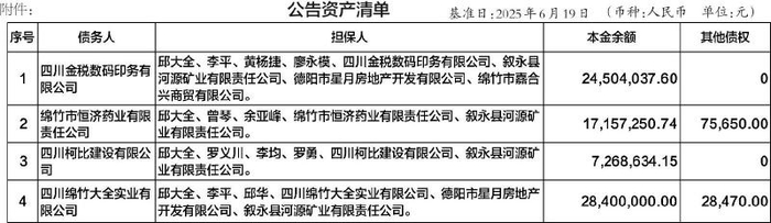 德阳市鑫瑞泓商贸有限责任公司 | 其他债权 | 扫保人 | 本金余额 | 序号 | 债务人 | | | --- | --- | --- | --- | --- | --- | | 邱大全、李平、黄杨捷、廖永葭、四川金税数码印务有限公司、叙永县 | 四川金税数码印务有 | 24,504,037.60 | 河源矿业有限责任公司、德阳市星月房地产开发有限公司、绵竹市嘉合 | | | | 限公司 | 兴电贸有限公司。 | | | | | | 绵竹市恒济药业有限 邱大全、曾琴、余亚峰、绵竹市恒济药业有限责任公司、叙永县河源矿 | 17.157.250.74 | 75,650.00 | 责任公司 | 业有限责任公司。 | | | 四川柯比建设有限公 邸大全、罗义川、李均、罗勇、四川柯比建设有限公司、叙永县河源矿 | 7.268.634.15 | 业有限责任公司。 | 司 | | | | 四川绵竹大全实业有 邱大全、李平、邱华、四川绵竹大全实业有限公司、德阳市星月房地产 | 28,400,000.00 | 28,470.00 | ਬ | 限公司 | 开发有限公司、叙永县河源矿业有限责任公司。 | 根据中国长城资产管理股份有 ...