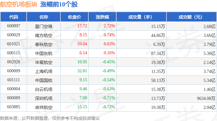 证券之星消息,1月8日航空机场板块较上一交易日下跌0.33%,厦门空港领跌。当日上证指数报收于 4082.98,下跌0.07%。深证成指报收于13959.48,下跌0.51%。航空机场板块个股涨跌见下表: | 代码 | 名称 | 收盘价 | 涨跌幅 | 成交量(手) | 成交额(元) | | --- | --- | --- | --- | --- | --- | | 600897 | 厦门空港 | 17.39 | -1.86% | 9.28万 | 1.62亿 | | 600029 | 南方航空 | 8.01 | -1.72% | 62.19万 | 4.97亿 | | 600221 | 海航控股 | 1.74 | -1.14% | 546.34万 | 9.52亿 | | 603885 | 吉祥航空 | 15.02 | -0.86% | 17.63万 | 2.65亿 | | 000089 | 深圳机场 | 6.96 | -0.57% | 13.47万 | 9376.33万 | | 601111 | 中国国航 | 9.13 | -0.22% | 54.80万 | 4.98亿 | | 002928 | 华夏航空 | ...