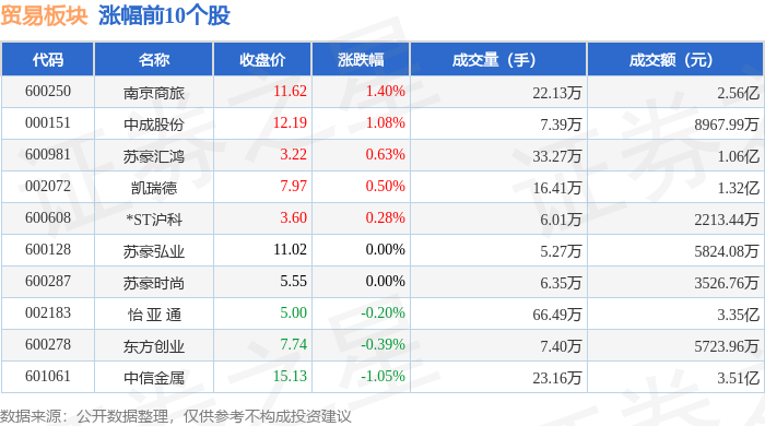 市场整体表现 - 2025年1月7日,贸易板块整体下跌0.47%,表现弱于大盘,当日上证指数上涨0.05%,深证成指上涨0.06% [1] - 板块内个股表现分化,领涨股为南京商旅(上涨1.40%),领跌股为江苏国泰(下跌1.63%)[1][2] 个股价格与交易情况 - 南京商旅(600250)收盘价11.62元,上涨1.40%,成交额2.56亿元,成交量22.13万手 [1] - 江苏国泰(002091)收盘价9.07元,下跌1.63%,成交额2.07亿元,成交量22.68万手 [2] - 中信金属(601061)收盘价15.13元,下跌1.05%,成交额3.51亿元,成交量23.16万手,为板块内成交额最高个股 [1][2] - 怡亚通(002183)收盘价5.00元,下跌0.20%,成交量66.49万手,为板块内成交量最高个股 [1][2] - 苏豪时尚(600287)与苏蒙弘业(600128)股价持平,涨跌幅为0.00% [1][2] 板块资金流向 - 当日贸易板块整体呈现主力资金净流出5127.8万元,而游资和散户资金分别净流入5033.41万元和94.39万元 [2] - 南京商旅(600250)获得主力资金净流入2232.76万元,主力净占比8.72%,为板块内主力资金流入最多的个股 [3] - 苏美达(600710)遭遇主力资金净流出1082.02万元,主力净占比-10.05%,为板块内主力资金流出最多的个股 [3] - 苏豪时尚(600287)主力净流入734.67万元,主力净占比高达20.83%,显示主力资金对该股关注度较高 [3] - 凯瑞德(002072)和东方创业(600278)均呈现主力资金净流出,分别为412.26万元和510.23万元 [3]