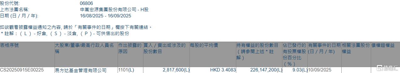 申万宏源(06806.HK)获易方达基金增持281.76万股