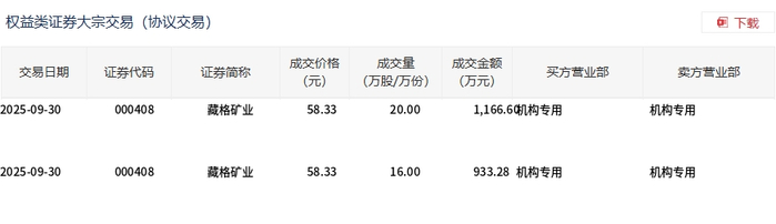 | 权益类证券大宗交易(协议交易) | | | | | | | 包 下载 | | --- | --- | --- | --- | --- | --- | --- | --- | | 交易日期 | 证券代码 | 证券简称 | 成交价格 (元) | 成交量 (万股/万份) | 成交金额 (万元) | 买方营业部 | 卖方营业部 | | 2025-09-30 | 000408 | 藏格矿业 | 58.33 | 20.00 | 1,166.6 机构专用 | | 机构专用 | | 2025-09-30 | 000408 | 藏格矿业 | 58.33 | 16.00 | 933.28 机构专用 | | 机构专用 | 9月30日,藏格矿业大宗交易成交36万股,成交额2099.88万元,占当日总成交额的2.43%,成交价58.33 元,较市场收盘价58.33元持平。 ...