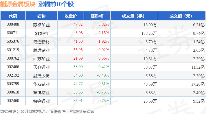 板块整体表现 - 能源金属板块较上一交易日上涨0.62% [1] - 上证指数上涨0.66%至3583.31点 深证成指上涨0.46%至11041.56点 [1] - 板块主力资金净流出8596.69万元 游资资金净流入8261.7万元 散户资金净流入334.99万元 [2] 个股价格表现 - 藏格矿业领涨板块 收盘价47.82元 涨幅3.82% 成交额6.21亿元 [1] - ST盛屯涨幅2.15%至8.08元 成交量108.25万手 成交额8.74亿元 [1] - 博迁新材上涨1.92%至41.30元 腾远钴业上涨0.92%至55.95元 西藏矿业微涨0.56%至21.69元 [1] - 天齐锂业下跌0.42%至38.09元 融捷股份下跌0.49%至34.80元 华友钴业下跌0.51%至42.77元 [1] - 寒锐钴业下跌0.73%至36.56元 赣锋锂业下跌0.75%至35.91元 [1] - 盛新锂能下跌1.64%至15.56元 永杉锂业下跌1.48%至10.00元 [2] 资金流向特征 - 藏格矿业主力净流出5259.40万元 占比8.47% 游资净流出716.39万元 散户净流出4543.01万元 [3] - 西藏矿业获主力净流入1105.84万元 占比4.82% 游资净流入569.87万元 [3] - 腾远钴业主力净流入740.85万元 游资净流入1045.39万元 占比3.98% [3] - 华友钴业主力净流出1238.84万元 游资净流入3662.82万元 占比2.12% [3] - 寒锐钴业主力净流出1735.76万元 占比6.98% 散户净流入1492.09万元 占比6.00% [3] - 天齐锂业主力净流出949.58万元 散户净流入732.94万元 [3] - 赣锋锂业主力净流出1134.07万元 游资净流出565.38万元 散户净流入1699.45万元 [3]
