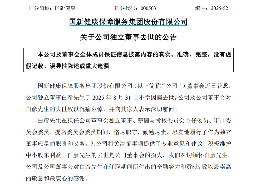 公司人事变动 - 国新健康独立董事白彦于2025年8月31日因病去世 享年60岁[1][4][5] - 白彦生前担任公司董事会独立董事 薪酬与考核委员会主任委员 审计委员会委员 提名委员会委员[1] - 白彦去世后公司董事会成员由9名变为8名 独立董事人数低于董事会成员三分之一[4] 公司治理状况 - 当前董事会人数未低于法定最低人数 但低于《公司章程》规定人数[4] - 公司将按法定程序尽快完成独立董事补选工作并及时履行信息披露义务[4] 人物背景 - 白彦为北京大学政府管理学院教授 博士生导师 应用经济学博士后 美国纽约大学高级访问学者[4] - 曾任际华集团独立董事 北京地铁运营有限公司外部董事 兼任中国商业法学研究会常务理事等职务[4] - 在北京大学法学院获法学博士学位 后在光华管理学院从事博士后研究[5]