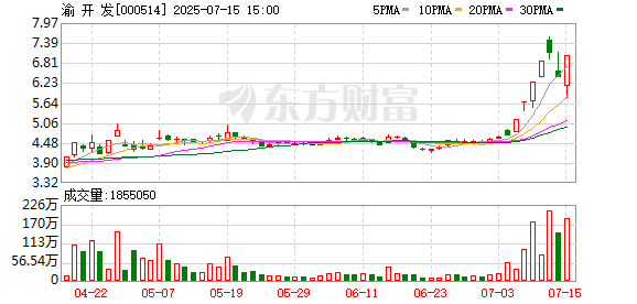 股价表现 - 渝开发在7个交易日内录得5个涨停,累计涨幅达49.79%,累计换手率为109.58% [2] - 截至当日14:47,该股成交量1.83亿股,成交金额11.50亿元,换手率21.73%,最新A股总市值59.15亿元 [2] - 因连续三个交易日内涨幅偏离值累计达20%及日跌幅偏离值达7%,该股3次上榜龙虎榜 [2] 资金动向 - 龙虎榜数据显示,机构净买入5592.63万元,营业部席位合计净买入7759.57万元 [2] - 近期主力资金净流入波动显著,其中7月10日净流入10490.29万元,7月11日净流出19451.98万元 [2] 财务数据 - 一季度公司实现营业总收入0.77亿元,同比下降1.64% [2] - 一季度净利润1.80亿元,同比增长786.39% [2]