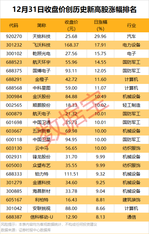 市场整体表现 - 12月31日A股三大指数涨跌不一 市场全天成交额2.07万亿元 较前一交易日缩量956亿元 [1] - 收盘上涨个股超2400只 其中收盘股价涨停的有63只 [1] - 盘面上 小红书概念领涨 板块内蓝色光标、挖金客均“20cm”涨停 军工电子、机场航运、快手等概念跟涨 化学纤维、医药商业、种植业与林业等概念跌幅居前 [1] 创历史新高个股分析 - 不含近一年上市的次新股 今日共有66股收盘价创历史新高 [2] - 机械设备、国防军工、汽车行业创新高的个股较为集中 分别有13股、10股、9股 [2] - 收盘价创历史新高股今日股价平均上涨6.51% [2] - 涨幅居前的个股包括 天铭科技上涨29.96% 飞沃科技上涨17.91% 乾照光电上涨15.75% 航天环宇上涨14.55% 国博电子上涨12.05% [3] 机构评级动态 - 今日机构研报共发布7条买入型评级记录 共涉及7股 包括视源股份、贵州茅台、唯万密封等 [4] - 机构买入型评级个股今日平均上涨1.62% 表现强于沪指 股价上涨的有4只 巴比食品涨停 [4] - 具体评级中 国投证券给予国电南自“买入-A”评级 预测目标价12.89元 较最新收盘价10.48元有23.00%上涨空间 国投证券给予视源股份“买入-A”评级 预测目标价48.65元 较最新收盘价39.63元有22.76%上涨空间 [5] 龙虎榜机构资金动向 - 本周机构专用席位现身86股的龙虎榜 合计净卖出1.24亿元 [6] - 机构专用席位一周净买入的共有38股 净买入金额在1亿元以上的有9股 [6] - 净买入金额最多的是万向钱潮 达2.89亿元 本周上涨26.19% 一周换手率为29.81% 累计成交额为154.12亿元 [6] - 净买入居前的个股还包括 中国卫通净买入2.46亿元 本周上涨26.21% 天际股份净买入1.68亿元 本周下跌6.20% 御银股份净买入1.67亿元 本周上涨33.29% [7] - 机构龙虎榜本周净卖出48股 7股净卖出金额逾1亿元 [8] - 净卖出金额最多的是航天发展 达4.01亿元 本周上涨17.22% 一周换手率为99.59% [8][9] - 净卖出居前的个股还包括 通宇通讯净卖出3.67亿元 吴志机电净卖出1.61亿元 金风科技净卖出1.28亿元 [9] 机构与北向资金协同 - 机构本周龙虎榜现身的个股中 有40股也出现深股通或沪股通的身影 [10] - 两大主力同向操作的有23股 万向钱潮、中国卫通、天际股份等机构和北向资金均为净买入 蓝色光标、顺灏股份、电广传媒等则遭机构及北向资金集体净卖出 [10] - 机构及北向资金出现分歧的个股中 久之洋机构一周净买入1.1亿元 深股通净卖出851.82万元 航天发展、通宇通讯等本周遭机构净卖出 北向资金则为净买入 [10]