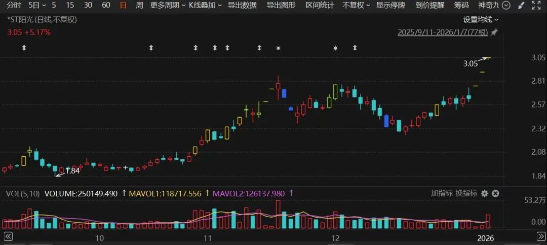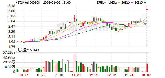 三连板后,*ST阳光(000608)抛出一份关于筹划控制权变更事项的停牌公告。 1月7日晚间,*ST阳光公告称,控股股东京基集团有限公司(简称"京基集团")正在筹划有关公司控制权变更事宜,该事项可能导致公司控股股东、实际 控制人发生变更。经公司向深圳证券交易所申请,公司股票自1月8日开市起停牌,预计停牌时间不超过2个交易日。 *ST阳光表示,近期公司经营情况正常,内外部经营环境未发生重大变化。除控股股东正在筹划有关公司控制权变更事宜外,公司、控股股东和实际控制 人不存在关于公司的应披露而未披露的重大事项,或处于筹划阶段的重大事项,以及股票异常波动期间控股股东、实际控制人未买卖公司股票。 截至1月7日收盘,*ST阳光已连续3个交易日涨停。当日晚间,*ST阳光披露了股票交易异常波动公告,公司股票交易价格连续三个交易日内(1月5日、1 月6日、1月7日)日收盘价格涨幅偏离值累计达到12.43%。 1月7日晚间,*ST阳光在公告中称,公司2024年度经审计的利润总额、净利润、扣除非经常性损益后的净利润为负值,且扣除后的营业收入低于3亿元, 根据相关规定,公司股票交易已被实施"退市风险警示"。若2025年经审计后的相关 ...