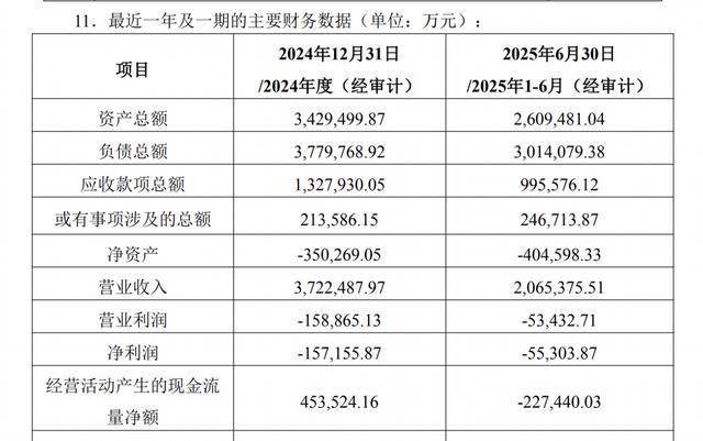 深蓝汽车成立于2018年5月,法定代表人为邓承浩,主营业务包括新能源汽车整车及汽车零部件的研 发、生产、加工、销售和咨询务等。 2024年、2025年上半年,深蓝汽车营业收入为372.25亿元、206.54万元,净亏损分别为15.72亿元、5.53 亿元。 | 11. 最近一年及一期的主要财务数据(单位:万元): | | | | --- | --- | --- | | 项目 | 2024年12月31日 /2024年度(经审计) | 2025年6月30日 /2025年1-6月(经审计) | | 资产总额 | 3.429.499.87 | 2.609.481.04 | | 负债总额 | 3.779.768.92 | 3.014.079.38 | | 应收款项总额 | 1,327,930.05 | 995.576.12 | | 或有事项涉及的总额 | 213,586.15 | 246.713.87 | | 净资产 | -350,269.05 | -404.598.33 | | 营业收入 | 3.722.487.97 | 2.065,375.51 | | 营业利润 | -158.865.13 | -53.432.71 ...