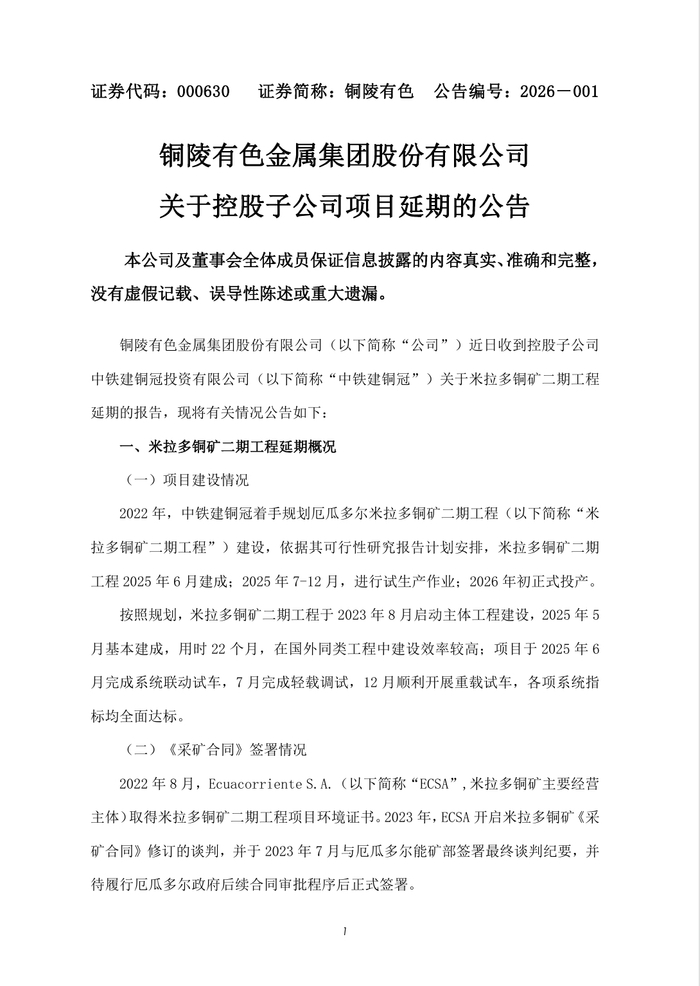 证券代码:000630 证券简称:铜陵有色 公告编号:2026-001 本公司及董事会全体成员保证信息披露的内容真实、准确和完整, 没有虚假记载、误导性陈述或重大遗漏。 铜陵有色金属集团股份有限公司(以下简称"公司")近日收到控股子公司 中铁建铜冠投资有限公司(以下简称"中铁建铜冠")关于米拉多铜矿二期工程 延期的报告,现将有关情况公告如下: 一、米拉多铜矿二期工程延期概况 (一)项目建设情况 2022 年,中铁建铜冠着手规划厄瓜多尔米拉多铜矿二期工程(以下简称"米 拉多铜矿二期工程")建设,依据其可行性研究报告计划安排,米拉多铜矿二期 工程 2025 年 6 月建成;2025 年 7-12 月,进行试生产作业;2026 年初正式投产。 按照规划,米拉多铜矿二期工程于 2023 年 8 月启动主体工程建设,2025 年 5 月基本建成,用时 22 个月,在国外同类工程中建设效率较高;项目于 2025 年 6 月完成系统联动试车,7 月完成轻载调试,12 月顺利开展重载试车,各项系统指 标均全面达标。 (二)《采矿合同》签署情况 2022 年 8 月,Ecuacorriente S.A.(以下简称"ECSA", ...