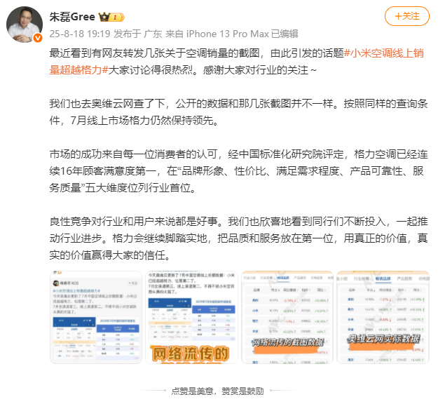 格力独家回应“小米空调线上销量超越格力”:监测数据与网传截图不一致,格力7月线上市场表现依然处于领先位置