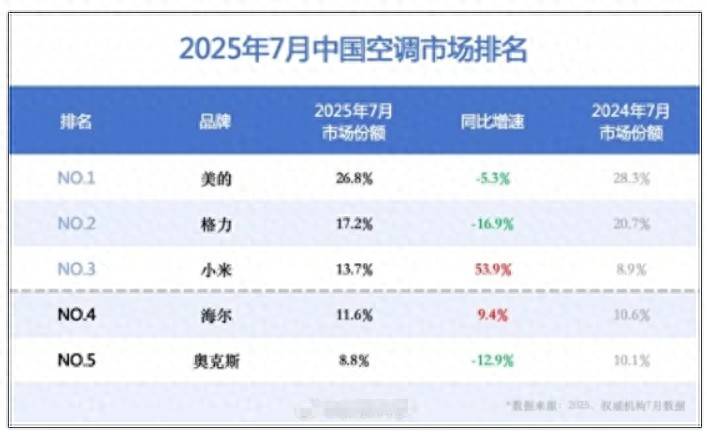 小米强势杀入“前三”,7月线上销量超格力,空调格局变了吗?