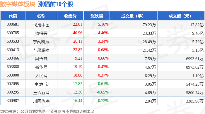 | 代码 | 名称 | 收盘价 | 涨跌幅 | 成交量(手) | | 成交额(元) | | | --- | --- | --- | --- | --- | --- | --- | --- | | 000681 | 视觉中国 | 22.81 | 5.16% | | 79.23万 | | 17.82亿 | | 300785 | 值得买 | 40.96 | 4.46% | | 23.33万 | | 9.46 Z | | 603533 | 掌阅科技 | 20.11 | 3.34% | | 28.49万 | | 5.72亿 | | 300413 | 芒果超媒 | 23.82 | 0.68% | | 21.42万 | | 5.13亿 | | 603466 | 风语筑 | 9.21 | 0.66% | | 7.59万 | | 6993.61万 | | 603888 | 新华网 | 19.19 | 0.47% | | 4.67万 | | 8973.02万 | | 603000 | 人民网 | 18.88 | 0.37% | | 6.29万 | | 1.19亿 | | 002095 | 生意宝 | 17.82 | -0.61% ...