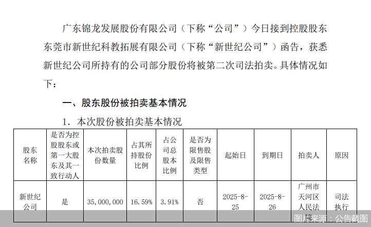 锦龙股份控股股东股份司法拍卖 - 公司控股股东新世纪公司持有的3500万股股份将被第二次司法拍卖 [1] - 拍卖股份占新世纪公司持股比例的16.59% [1] - 拍卖股份占公司总股本的3.91% [1] - 拍卖由广州市天河区人民法院发起 [1] - 拍卖将于2025年8月25日在淘宝网司法拍卖网络平台进行 [1] - 拍卖期为一天 [1] - 拍卖原因为司法执行 [1]