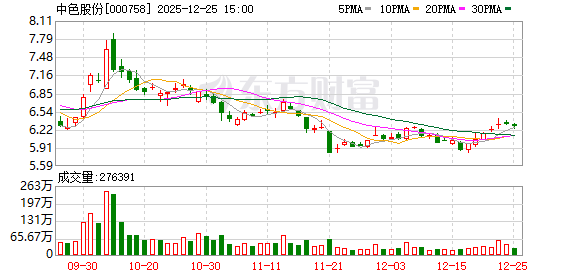 截至12月19日,中色股份股东户数11.96万,较上期减少0.81%;人均流通股16527股,较上期增加 0.82%。2025年1月-9月,中色股份实现营业收入69.31亿元,同比减少0.21%;归母净利润4.81亿元,同 比增长42.84%。 资金流向方面,主力资金净流出310.98万元,特大单买入893.76万元,占比6.09%,卖出830.50万元,占 比5.66%;大单买入2593.58万元,占比17.69%,卖出2967.81万元,占比20.24%。 中色股份今年以来股价涨30.98%,近5个交易日涨4.06%,近20日涨6.30%,近60日涨2.07%。 资料显示,中国有色金属建设股份有限公司位于北京市朝阳区安定路10号中国有色大厦,成立日期1983 年9月16日,上市日期1997年4月16日,公司主营业务涉及以有色金属采选与冶炼、国际工程承包等。主 营业务收入构成为:承包工程58.50%,有色金属38.03%,冶金机械2.62%,其他0.84%。 中色股份所属申万行业为:有色金属-工业金属-铅锌。所属概念板块包括:国资改革、央企改革、低 价、一带一路、中盘等。 12月26日,中色股份盘中上涨2. ...