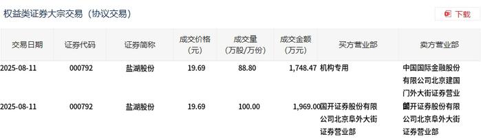 盐湖股份发生2笔大宗交易 合计成交3717.47万元