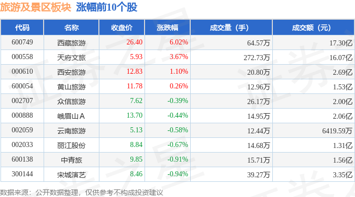 板块整体表现 - 旅游及景区板块当日下跌0.79%,领跌个股为凯撒旅业(跌幅4.81%)[1] - 上证指数下跌0.46%至3666.44点,深证成指下跌0.87%至11451.43点[1] - 板块主力资金净流出8929.34万元,游资净流出2973.97万元,散户资金净流入1.19亿元[2] 个股涨跌情况 - 西藏旅游涨幅6.02%居首,收盘价26.4元,成交额17.3亿元[1] - 天府文旅涨幅3.67%位列第二,收盘价5.93元,成交额16.07亿元[1] - 凯撒旅业跌幅最大达4.81%,收盘价4.75元,成交量113.86万手[2] - 西域旅游跌幅2.86%居次,收盘价40.14元,成交额8.32亿元[2] 资金流向分布 - 天府文旅获主力资金净流入4996.74万元(净占比3.11%),游资净流入2799.62万元(净占比1.74%)[3] - 西藏旅游获主力净流入4297.84万元(净占比2.48%),但游资净流出5393.08万元(净占比3.12%)[3] - 西安旅游主力净流入2961.18万元(净占比11.02%),为板块最高净占比[3] - 九华旅游主力净流出293.67万元(净占比2.49%),但游资净流入597.4万元(净占比5.06%)[3]