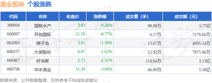 证券之星消息,12月26日渔业板块较上一交易日下跌1.66%,中水渔业领跌。当日上证指数报收于 3963.68,上涨0.1%。深证成指报收于13603.89,上涨0.54%。渔业板块个股涨跌见下表: | 代码 | 名称 | 主力净流入 (元) | 主力净占比 游资净流入 (元) | | 游资净占比 散户净流入 (元) | | 散户净占比 | | --- | --- | --- | --- | --- | --- | --- | --- | | 600467 | 好当家 | > 186.79万 | 0.60% | 915.87万 | 2.92% | -1102.66万 | -3.52% | | 600257 大湖股份 | | -150.42万 | -1.91% | 460.62万 | 5.85% | -310.19万 | -3.94% | | 600097 开创国际 | | -238.47万 | -3.32% | -196.43万 | -2.74% | 434.90万 | 6.06% | | 002069 | 障子岛 | -356.60万 | -7.14% | 238.88万 | 4.78% | 117.72万 ...