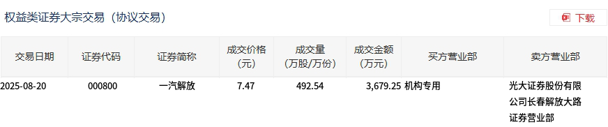 大宗交易概况 - 8月20日一汽解放发生大宗交易492.54万股,成交金额3679.25万元,占当日总成交额3.29% [1] - 成交价格7.47元较市场收盘价7.54元折价0.93% [1] 交易细节 - 买方为机构专用席位,卖方为光大证券长春解放大路营业部 [2] - 证券代码000800,成交量为492.54万股,成交额3679.25万元 [2]