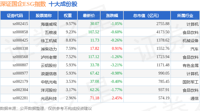 深证国企ESG指数市场表现 - 深证国企ESG指数于1月7日报收1436.92点,单日下跌0.32% [1] - 指数当日成交额为436.67亿元,换手率为1.69% [1] - 指数成份股中19家上涨,29家下跌,中钨高新以7.67%的涨幅领涨,云铝股份以3.21%的跌幅领跌 [1] 指数十大权重股详情 - 海康威视为第一大权重股,权重9.57%,最新价30.07元,下跌1.05%,总市值2755.88亿元,属于计算机行业 [1] - 五粮液权重9.23%,最新价107.52元,下跌0.60%,总市值4173.50亿元,属于食品饮料行业 [1] - 徐工机械权重8.83%,最新价11.73元,下跌0.26%,总市值1378.62亿元,属于机械设备行业 [1] - 潍柴动力权重7.59%,最新价17.82元,上涨0.91%,总市值1552.76亿元,属于汽车行业 [1] - 泸州老窖权重7.52%,最新价117.12元,下跌1.26%,总市值1723.94亿元,属于食品饮料行业 [1] - 云铝股份权重5.93%,最新价33.78元,下跌3.21%,总市值1171.48亿元,属于有色金属行业 [1] - 浪潮信息权重5.93%,最新价67.42元,下跌0.98%,总市值990.05亿元,属于计算机行业 [1] - 中航光电权重3.53%,最新价37.08元,下跌0.40%,总市值785.45亿元,属于国防军工行业 [1] - 洋河股份权重3.17%,最新价62.26元,下跌1.77%,总市值937.91亿元,属于食品饮料行业 [1] - 光迅科技权重2.96%,最新价71.18元,上涨2.45%,总市值574.19亿元 [1] 指数成份股资金流向 - 指数成份股当日整体主力资金净流出2.22亿元,游资资金净流出1.27亿元,散户资金净流入3.48亿元 [1] - 中钨高新主力资金净流入3.04亿元,主力净占比8.61%,游资净流出6606.25万元,散户净流出2.38亿元 [2] - 中核科技主力资金净流入1.59亿元,主力净占比8.33%,游资净流出1106.21万元,散户净流出1.48亿元 [2] - 潍柴动力主力资金净流入1.00亿元,主力净占比8.69%,游资净流出491.23万元,散户净流出9529.92万元 [2] - 赢合科技主力资金净流入6743.63万元,主力净占比5.90%,游资净流出198.74万元,散户净流出6544.89万元 [2] - 北部湾港主力资金净流入6392.94万元,主力净占比9.50%,游资净流出1947.49万元,散户净流出4445.45万元 [2] - 光迅科技主力资金净流入4302.10万元,主力净占比1.36%,游资净流出3639.92万元,散户净流出662.19万元 [2] - 徐工机械主力资金净流入3380.36万元,主力净占比4.66%,游资净流出4563.45万元,散户净流入1183.10万元 [2] - 中油资本主力资金净流入2654.63万元,主力净占比1.93%,游资净流入171.33万元,散户净流出2825.96万元 [2] - 飞亚达主力资金净流入2580.78万元,主力净占比8.58%,游资净流出971.75万元,散户净流出1609.02万元 [2] - 泰胜风能主力资金净流入2571.53万元,主力净占比1.37%,游资净流入1.36亿元,散户净流出1.62亿元 [2]