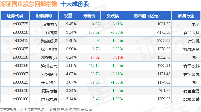 深证国企股东回报指数市场表现 - 指数于1月7日报收1689.85点,单日下跌0.89% [1] - 当日成交额为375.99亿元,换手率为1.66% [1] - 指数成份股中13家上涨,35家下跌,整体表现疲弱 [1] 指数十大权重股详情 - 京东方A权重最高,为9.45%,当日股价下跌3.11%,总市值1631.25亿元 [1] - 五粮液权重9.34%,股价下跌0.60%,总市值4173.50亿元 [1] - 海康威视权重7.48%,股价下跌1.05%,总市值2755.88亿元 [1] - 徐工机械权重6.90%,股价微跌0.26%,总市值1378.62亿元 [1] - 潍柴动力权重6.24%,股价逆势上涨0.91%,总市值1552.76亿元 [1] - 泸州老窖权重5.88%,股价下跌1.26%,总市值1723.94亿元 [1] - 云铝股份权重4.87%,股价领跌3.21%,总市值1171.48亿元 [1] - 长安汽车权重3.67%,股价下跌1.00%,总市值1174.82亿元 [1] - 铜陵有色权重3.24%,股价下跌1.52%,总市值781.77亿元 [1] - 申万宏源权重3.14%,股价下跌1.09%,总市值1359.67亿元 [1] 成份股行业分布 - 十大权重股覆盖电子、食品饮料、计算机、机械设备、汽车、有色金属及非银金融等多个行业 [1] 成份股资金流向 - 指数所有成份股当日主力资金净流出合计3.96亿元 [1] - 游资资金净流出合计3671.22万元 [1] - 散户资金净流入合计4.33亿元 [1] - 神火股份主力资金净流入2.84亿元,净占比13.91%,但游资与散户均呈净流出 [2] - 潍柴动力主力资金净流入1.00亿元,净占比8.69% [2] - 古井贡酒主力资金净流入7639.66万元,净占比11.35% [2] - 北部湾港主力资金净流入6392.94万元,净占比9.50% [2] - 徐工机械主力资金净流入3380.36万元,净占比4.66% [2] - 中油资本主力资金净流入2654.63万元,净占比1.93% [2] - 华菱钢铁主力资金净流入2472.46万元,净占比4.66% [2] - 华润三九主力资金净流入2003.90万元,净占比6.06% [2] - 中金岭南主力资金净流入1806.22万元,净占比1.40% [2] - 招商蛇口主力资金净流入1642.31万元,净占比3.27% [2]