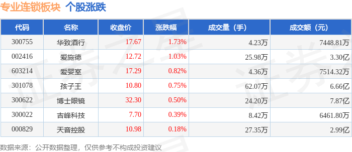 市场整体表现 - 2023年12月26日,专业连锁板块整体下跌0.77%,表现弱于大盘,当日上证指数上涨0.1%至3963.68点,深证成指上涨0.54%至13603.89点 [1] - 板块内7只样本股中,仅1只上涨,6只下跌,华致酒行以-2.25%的跌幅领跌板块 [1] 个股价格与交易表现 - 爱施德是板块内唯一上涨个股,收盘价12.16元,微涨0.33%,成交额2.25亿元 [1] - 跌幅居前的个股包括:天音控股下跌1.31%至10.57元,爱婴室下跌1.61%至17.16元,吉峰科技下跌1.15%至7.77元 [1] - 成交量方面,孩子王成交50.67万手,成交额5.37亿元,为板块内成交最活跃个股 [1] 板块资金流向 - 当日专业连锁板块整体呈现主力资金和游资净流出,散户资金净流入的格局 [1] - 板块主力资金净流出1.15亿元,游资资金净流出3174.5万元,散户资金净流入1.46亿元 [1] 个股资金流向明细 - 天音控股主力资金净流出最多,达5329.03万元,主力净占比为-22.90%,但其散户资金净流入4422.30万元 [2] - 孩子王主力资金净流出3816.72万元,主力净占比-7.10%,同时散户资金净流入5783.52万元 [2] - 爱婴室主力资金净流出1554.33万元,主力净占比高达-15.97%,为占比最高个股 [2] - 博士眼镜游资净流出1705.01万元,游资净占比-4.87%,但其散户净流入2665.71万元,散户净占比7.62% [2] - 华致酒行主力资金净流出801.28万元,主力净占比-7.77%,其散户资金净流入712.80万元 [2] - 吉峰科技是唯一获得游资净流入的个股,净流入396.98万元,游资净占比6.59% [2]