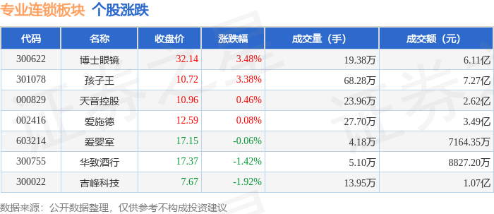 市场表现 - 1月5日专业连锁板块整体上涨0.85%,领先个股为博士眼镜,涨幅3.48% [1] - 当日上证指数上涨1.38%至4023.42点,深证成指上涨2.24%至13828.63点 [1] - 板块内个股表现分化,孩子王上涨3.38%,天音控股上涨0.46%,爱施德微涨0.08%,而爱婴室、华致酒行、吉峰科技分别下跌0.06%、1.42%、1.92% [1] 个股交易数据 - 博士眼镜成交额6.11亿元,成交量19.38万手,收盘价32.14元 [1] - 孩子王成交额7.27亿元,成交量68.28万手,收盘价10.72元 [1] - 天音控股成交额2.62亿元,成交量23.96万手 [1] - 爱施德成交额3.49亿元,成交量27.70万手 [1] - 爱婴室、华致酒行、吉峰科技成交额分别为7164.35万元、8827.20万元、1.07亿元 [1] 板块资金流向 - 专业连锁板块整体主力资金净流出153.75万元,游资资金净流出286.44万元,散户资金净流入440.19万元 [1] - 孩子王主力资金净流出4719.79万元,主力净占比-6.49%,散户资金净流出5759.24万元,散户净占比-7.92% [2] - 博士眼镜主力资金净流入2970.33万元,主力净占比4.86%,但散户资金净流出2840.70万元,散户净占比-4.65% [2] - 爱施德游资资金净流出2800.24万元,游资净占比-8.03%,散户资金净流入3191.66万元,散户净占比9.15% [2] - 华致酒行主力资金净流出1897.65万元,主力净占比-21.50% [2] - 吉峰科技主力资金净流出2304.66万元,主力净占比-21.59% [2] - 天音控股主力资金净流出2334.46万元,主力净占比-8.92%,但散户资金净流入3882.33万元,散户净占比14.84% [2]