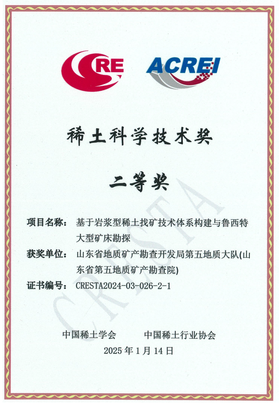 山东省地矿局五队找矿成果荣获稀土科学技术奖