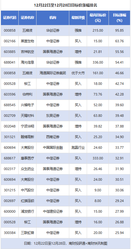 券商评级与目标价概览 - 在12月22日至12月28日期间,券商共发布49次上市公司目标价,按最新收盘价计算,目标价涨幅排名前三的公司为五粮液(目标价涨幅95.85%)、莱茵生物(目标价涨幅63.76%)和吉祥航空(目标价涨幅55.56%)[1] - 同期,共有177家上市公司获得券商推荐,其中领益智造和中国神华均获得4家券商推荐,大商股份等公司获得3家券商推荐[3] 高目标价涨幅公司详情 - 五粮液获得华创证券给予“强推”评级,目标价215.00元,较最新价涨幅95.85%,同时获得海通国际证券集团“优于大市”评级,目标价161.00元,涨幅46.66%[2] - 莱茵生物获得中信证券“买入”评级,目标价15.00元,较最新价涨幅63.76%[2] - 吉祥航空获得国泰君安证券“增持”评级,目标价21.81元,较最新价涨幅55.56%[2] - 海光信息获得华创证券“强推”评级,目标价336.00元,较最新价涨幅54.41%[2] 获多家券商推荐的公司 - 领益智造(消费电子行业)获得4家券商推荐,最新收盘价为15.40元[4] - 中国神华(煤炭开采行业)获得4家券商推荐,最新收盘价为40.07元[4] - 大商股份(一般零售行业)获得3家券商推荐,最新收盘价为18.39元,同时获得中国国际金融“跑赢行业”评级(目标价24.60元,涨幅33.77%)和中信证券“买入”评级(目标价24.00元,涨幅30.51%)[2][4] - 五粮液(白酒行业)获得3家券商推荐,最新收盘价为109.78元[4] - 海光信息(半导体行业)获得3家券商推荐,最新收盘价为217.60元[4] 评级被调高的公司 - 在12月22日至12月28日期间,券商共调高上市公司评级5家次[4] - 北京君正(半导体行业)被中邮证券从“增持”调高至“买入”[4][5] - 山东赫达(化学制品行业)被华安证券从“增持”调高至“买入”[4][5] - 海光信息(半导体行业)被华创证券从“推荐”调高至“强推”[4][5] - 鹏辉能源(电池行业)被中信建投证券从“增持”调高至“买入”[5] - 华盛锂电(电池行业)被东吴证券从“增持”调高至“买入”[5] 获得首次覆盖的公司 - 在12月22日至12月28日期间,券商共给出80次首次覆盖[5] - 中汽股份(汽车服务行业)获得中信证券首次覆盖,给予“买入”评级[5][6] - 豆神教育(教育行业)获得东吴证券首次覆盖,给予“买入”评级[5][6] - 兖矿能源(煤炭开采行业)获得西部证券首次覆盖,给予“买入”评级[5][6] - 小商品城(一般零售行业)获得信达证券首次覆盖,给予“买入”评级[5][6] - 金达威(食品加工行业)获得东吴证券首次覆盖,给予“买入”评级[5][6]