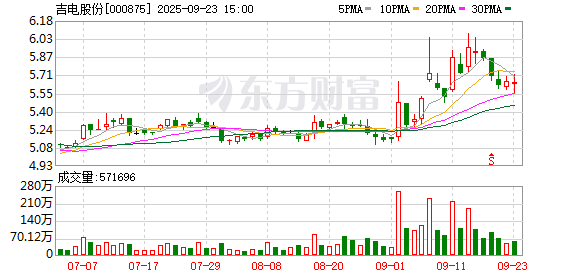 分红方面,吉电股份A股上市后累计派现9.69亿元。近三年,累计派现7.64亿元。 资料显示,吉林电力股份有限公司位于吉林省长春市人民大街9699号,成立日期1997年11月20日,上市 日期2002年9月26日,公司主营业务涉及发电(风电、太阳能、水电、火电、分布式能源、气电、生物 质、核能)、供热(民用、工业)、综合智慧能源供应、清洁能源投资开发、电站检修、科技项目研发、配 售电等业务。主营业务收入构成为:煤电产品33.67%,光伏产品29.55%,风电产品23.40%,热力产品 10.86%,运维及其他2.52%。 吉电股份所属申万行业为:公用事业-电力-电能综合服务。所属概念板块包括:氢能源、风能、海上风 电、新能源、储能等。 截至9月19日,吉电股份股东户数15.43万,较上期减少3.59%;人均流通股21654股,较上期增加 3.73%。2025年1月-6月,吉电股份实现营业收入65.69亿元,同比减少4.63%;归母净利润7.26亿元,同 比减少33.72%。 9月30日,吉电股份盘中上涨2.12%,截至10:03,报6.25元/股,成交3.38亿元,换手率1.65%,总市值 226.70亿元。 ...