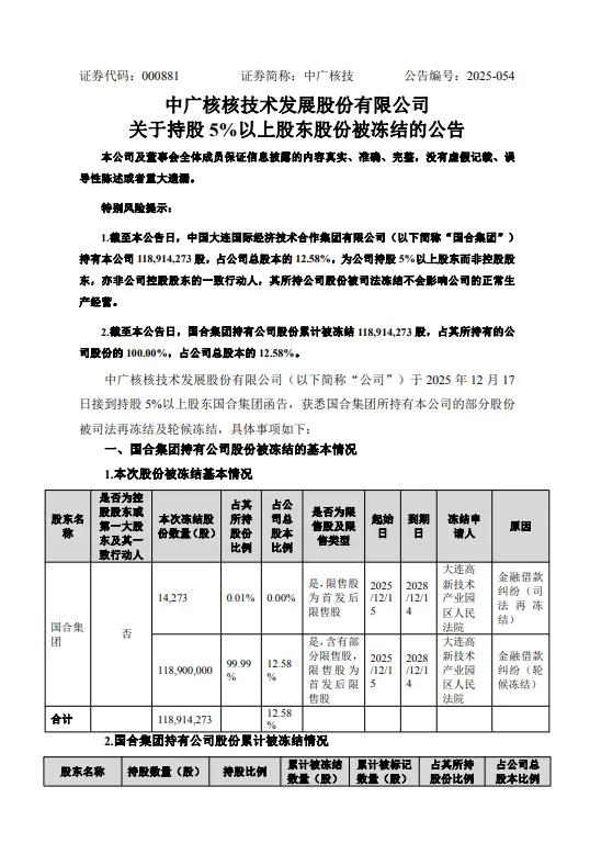 12月19日,中广核技(000881)公告称,公司于2025年12月17日接到持股5%以上股东中国大连国际经 济技术合作集团有限公司(简称"国合集团")函告,获悉国合集团所持有本公司的部分股份被司法再冻 结及轮候冻结。 截至本公告日,国合集团持有本公司118,914,273股,占公司总股本的12.58%,为公司持股5%以上股东 而非控股股东,亦非公司控股股东的一致行动人,其所持公司股份被司法冻结不会影响公司的正常生产 经营。 截至本公告日,国合集团持有公司股份累计被冻结118,914,273股,占其所持有的公司股份的100.00%, 占公司总股本的12.58%。 | 股东名称 持股教量(股) 特股比例 | | --- | 据了解,因金融借款纠纷,大连高新技术产业园区人民法院于12月15日申请将国合集团所持中广核技 14,273股、118,900,000股司法冻结,到期日为2028年12月14日。 12月19日,中广核技(000881)公告称,公司于2025年12月17日接到持股5%以上股东中国大连国际经 济技术合作集团有限公司(简称"国合集团")函告,获悉国合集团所持有本公司的部分股份被司法再冻 结及轮候冻结 ...