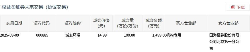 大宗交易概况 - 城发环境于2025年9月9日发生大宗交易成交100万股,成交金额1499万元,占当日总成交额14.62% [1] - 成交价格14.99元,较市场收盘价15.11元折价0.79% [1] 交易细节 - 买方为机构专用席位,卖方为国海证券股份有限公司北京第一分公司 [2] - 证券代码000885,证券简称城发环境 [2]