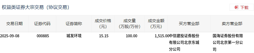 大宗交易概况 - 2025年9月8日城发环境发生大宗交易成交100万股 成交金额1515万元 占当日总成交额12.65% [1] - 成交价格15.15元较市场收盘价15.29元折价0.92% [1] 交易细节 - 买方营业部为中信建投证券股份有限公司北京东城分公司 [2] - 卖方营业部为国海证券股份有限公司北京第一分公司 [2] - 证券代码000885 证券简称城发环境 [2]
