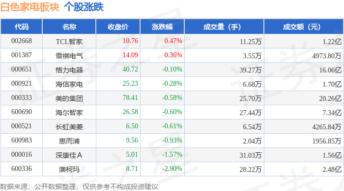 白色家电板块市场表现 - 2023年12月29日,白色家电板块整体下跌0.48%,表现弱于上证指数(上涨0.04%)和深证成指(下跌0.49%)[1] - 板块内个股普遍下跌,10只样本股中仅2只上涨,领跌个股为澳柯玛(下跌2.90%)和深康佳A(下跌1.57%)[1] - 板块当日主力资金净流入6074.62万元,游资资金净流入184.76万元,但散户资金净流出6259.39万元,显示主力与散户资金流向出现分歧[1] 个股价格与交易情况 - TCL智家收盘价10.76元,上涨0.47%,成交额1.22亿元,成交量11.25万手,是板块中涨幅最大的个股[1] - 雪祺电气收盘价14.09元,上涨0.36%,成交额4973.80万元,成交量3.55万手[1] - 行业龙头美的集团收盘价78.41元,下跌0.58%,成交额20.26亿元,成交量25.70万手,是板块中成交额最高的个股[1] - 格力电器收盘价40.72元,微跌0.10%,成交额16.06亿元,成交量39.27万手[1] - 海尔智家收盘价26.58元,下跌0.60%,成交额7.34亿元,成交量27.44万手[1] - 澳柯玛收盘价8.71元,下跌2.90%,成交额2.48亿元,成交量28.22万手,是板块中跌幅最大的个股[1] 个股资金流向分析 - 格力电器获得主力资金大幅净流入1.60亿元,主力净占比达9.98%,但游资净流出5817.25万元,散户净流出1.02亿元[2] - 美的集团主力资金净流入4198.01万元,主力净占比2.07%,游资净流出5255.36万元,散户净流入1057.35万元[2] - 海尔智家主力资金净流出8195.45万元,主力净占比-11.17%,是板块中主力净流出额最高的个股,但游资净流入7206.88万元进行了一定对冲[2] - 深康佳A主力资金净流出3036.70万元,主力净占比高达-19.52%,是板块中主力净流出占比最高的个股,散户资金净流入2775.74万元[2] - 长虹美菱主力资金净流出646.21万元,主力净占比-15.15%,游资净流入486.92万元[2] - 海信家电主力资金净流出861.04万元,游资净流入1019.45万元[2] - 澳柯玛主力资金净流出652.41万元,但游资净流入1532.73万元,游资净占比6.19%[2] - TCL智家主力资金净流出345.10万元,游资净流入715.75万元[2]