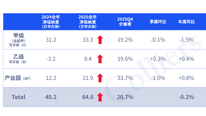 市场整体表现 - 2025年北京甲级写字楼市场需求复苏超预期,全年净吸纳量达到33万平方米,已连续两年实现超30万平方米的规模性去化 [1] - 2025年北京全市甲级写字楼新增供应量仅18.8万平方米,有限供给与稳健需求适配,推动年末空置率降至19.2%,同比下降约1.5个百分点 [1] - 2025年北京甲级写字楼市场平均净有效租金降至222元每月每平方米,同比下降11.5%,但降幅较上年收窄4.9个百分点,下行压力有所缓解 [2] 细分市场数据 - 2025年北京甲级(含超甲)写字楼净吸纳量为33.3万平方米,年末空置率19.2%,年度同比下降1.5个百分点 [2] - 2025年乙级写字楼净吸纳量由2024年的-3.2万平方米转为正增长9.4万平方米,但年末空置率同比上升0.4个百分点至19.6% [2] - 2025年产业园市场净吸纳量为21.9万平方米,较2024年的12.2万平方米大幅增长,年末空置率为23.7% [2] - 2025年北京写字楼市场总净吸纳量为64.6万平方米,较2024年的40.2万平方米显著提升,总空置率同比下降0.2个百分点至20.7% [2] 区域与板块分化 - 中关村板块成为2025年最大亮点,其甲级写字楼市场全年净吸纳量超17.6万平方米,占全市总量的53%,创近20年峰值纪录 [3] - 市场热度高度聚焦于个别子市场及非核心板块的高性价比项目,核心区域成熟写字楼市场表现未达预期,区域分化态势明显 [3] - 2025年核心区域成熟子市场平均租金同比降幅普遍超10%,跨资产类别和跨市场板块的竞争加剧 [3] 未来挑战与供需结构 - 宏观有效需求不足仍是制约办公楼市场需求持续恢复的系统性问题 [4] - 2026年部分市场化项目将面临现有租户退租和缩租,包括部分国央企等大体量租户整合搬迁回自有物业,此类需求收缩将抵消部分新增需求的积极影响 [4] - 2026年市场将出现显著的地理供需错配,核心市场新增供应量将超过70万平方米,其中90%集中在东部子市场,但近两年的增量需求高度集中在西部子市场,预计将导致东部市场竞争进一步升级 [4]