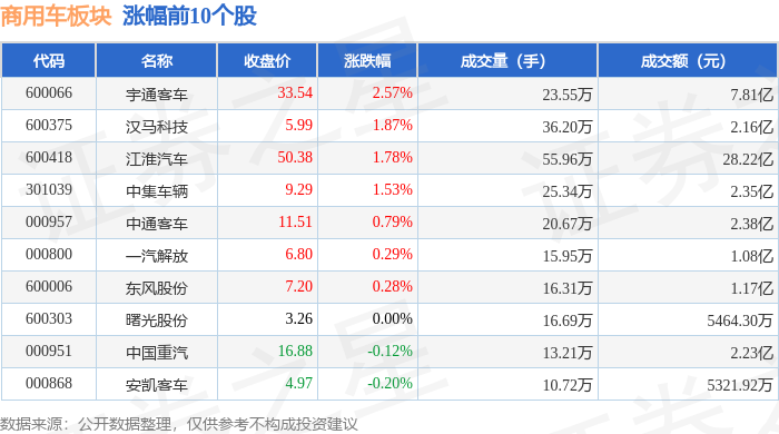 | 代码 | 名称 | 收盘价 | 涨跌幅 | 成交量(手) | 成交额(元) | | --- | --- | --- | --- | --- | --- | | 600066 | 字通客车 | 33.54 | 2.57% | 23.55万 | 7.81亿 | | 600375 | 汉马科技 | 5.99 | 1.87% | 36.20万 | 2.16亿 | | 600418 | 江淮汽车 | 50.38 | 1.78% | 55.96万 | 28.22亿 | | 301039 | 中集车辆 > | 9.29 | 1.53% | 25.34万 | 2.35亿 | | 000957 | 中通客车 | 11.51 | 0.79% | 20.67万 | 2.38亿 | | 000800 | 一汽解放 | 6.80 | 0.29% | 15.95万 | 1.08亿 | | 600006 | 东风股份 | 7.20 | 0.28% | 16.31万 | 1.17亿 | | 600303 | 曙光股份 | 3.26 | 0.00% | 16.69万 | 5464.30万 | | 000951 | 中国車汽 | + 16. ...
