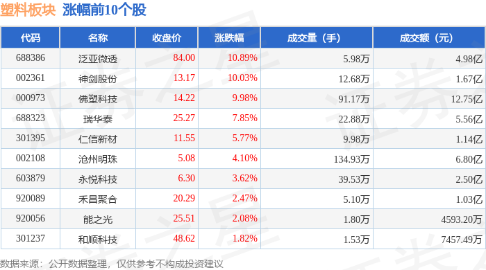 证券之星消息,12月26日塑料板块较上一交易日下跌0.11%,国风新材领跌。当日上证指数报收于 3963.68,上涨0.1%。深证成指报收于13603.89,上涨0.54%。塑料板块个股涨跌见下表: | 代码 | 名称 | 收盘价 | 涨跌幅 | 成交量(手) | 成交额(元) | | --- | --- | --- | --- | --- | --- | | 688386 | 泛亚微透 | 84.00 | 10.89% | 5.98万 | 4.98亿 | | 002361 | 神剑股份 | 13.17 | 10.03% | 12.68万 | · 1.67亿 | | 000973 | 佛塑科技 | 14.22 | 9.98% | 91.17万 | 12.75 亿 | | 688323 | 瑞华泰 | 25.27 | 7.85% | 22.88万 | 5.56亿 | | 301395 | 仁信新材 | 11.55 | 5.77% | 9.98万 | 1.14亿 | | 002108 | 沧州明珠 | 5.08 | 4.10% | 134.93万 | 6.80亿 | | 603879 | 永倪科技 | 6.30 ...